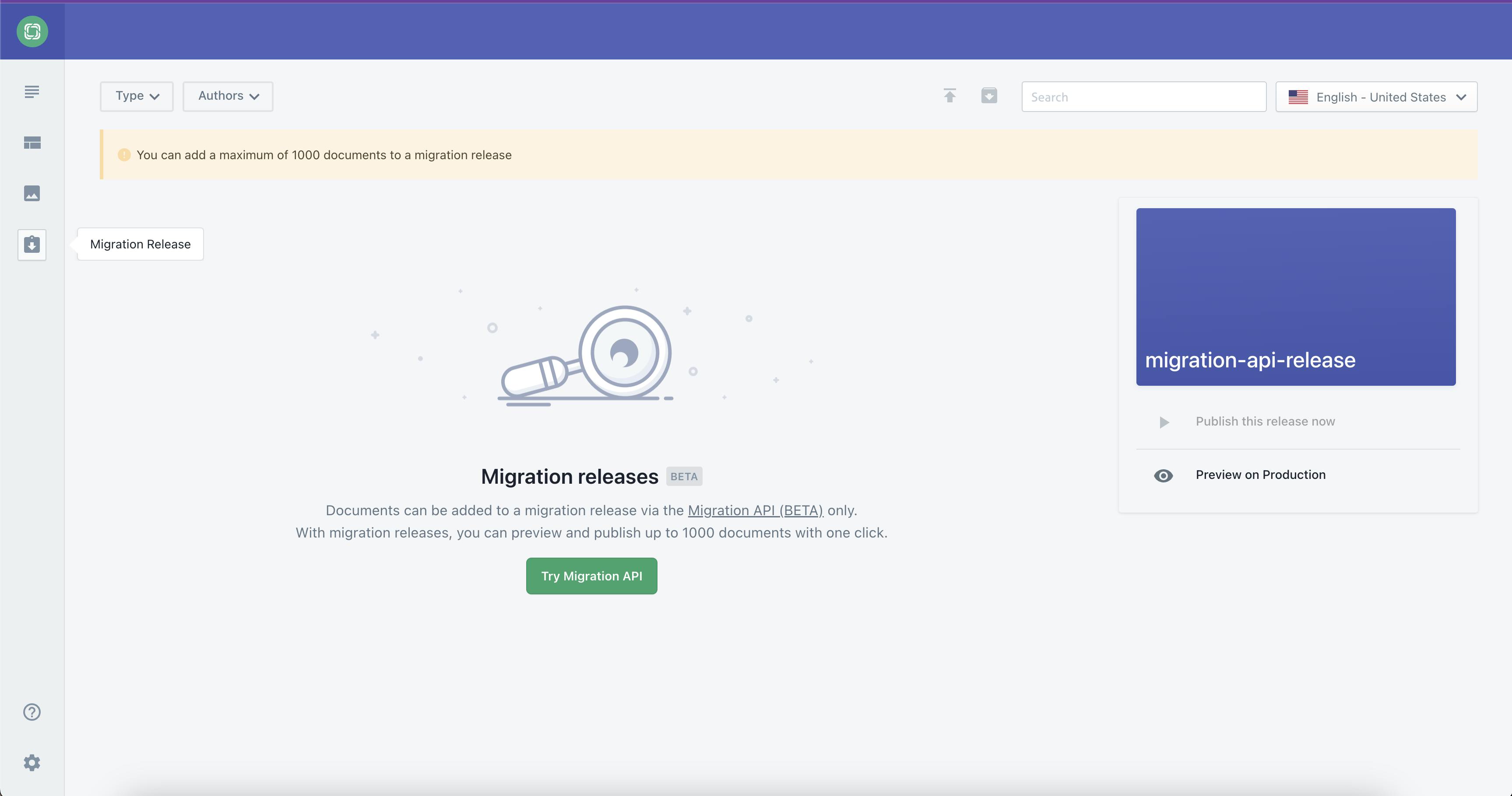 By default, documents created or updated via the Migration API will be added to a migration release, accessible from the Migration Releases